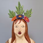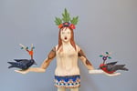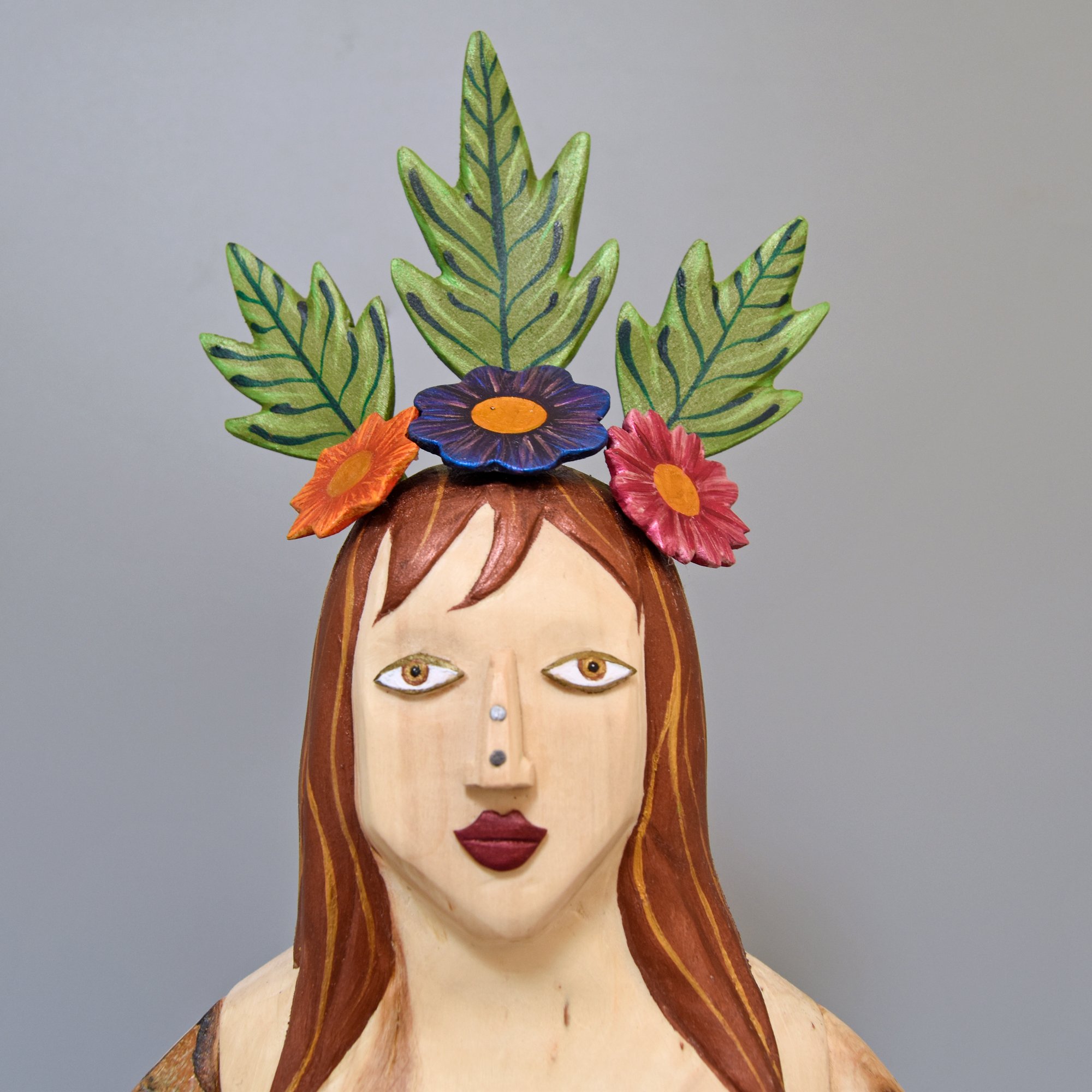 Carved from fallen aspen wood and mounted on a base made from reclaimed architectural salvage this is called Beauty and the Birds. It’s painted with acrylic. The natural wood is finished with wax to protect the surface and enhance the grain. The sculpture comes apart for shipping and requires simple assembly. 43.5" x 21" x 11" *Shipping to Hawaii and Alaska will require additional charges.