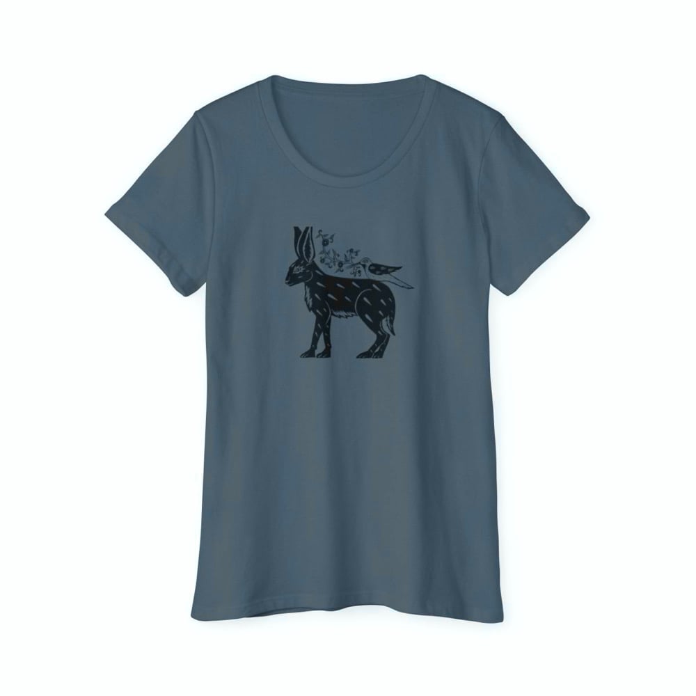 This comfortable cotten T shirt features an illustration by Elizabeth Frank of a black rabbit. The shirt color is stone blue. It's a unisex design and runs true to size. Ships in 2-3 weeks.