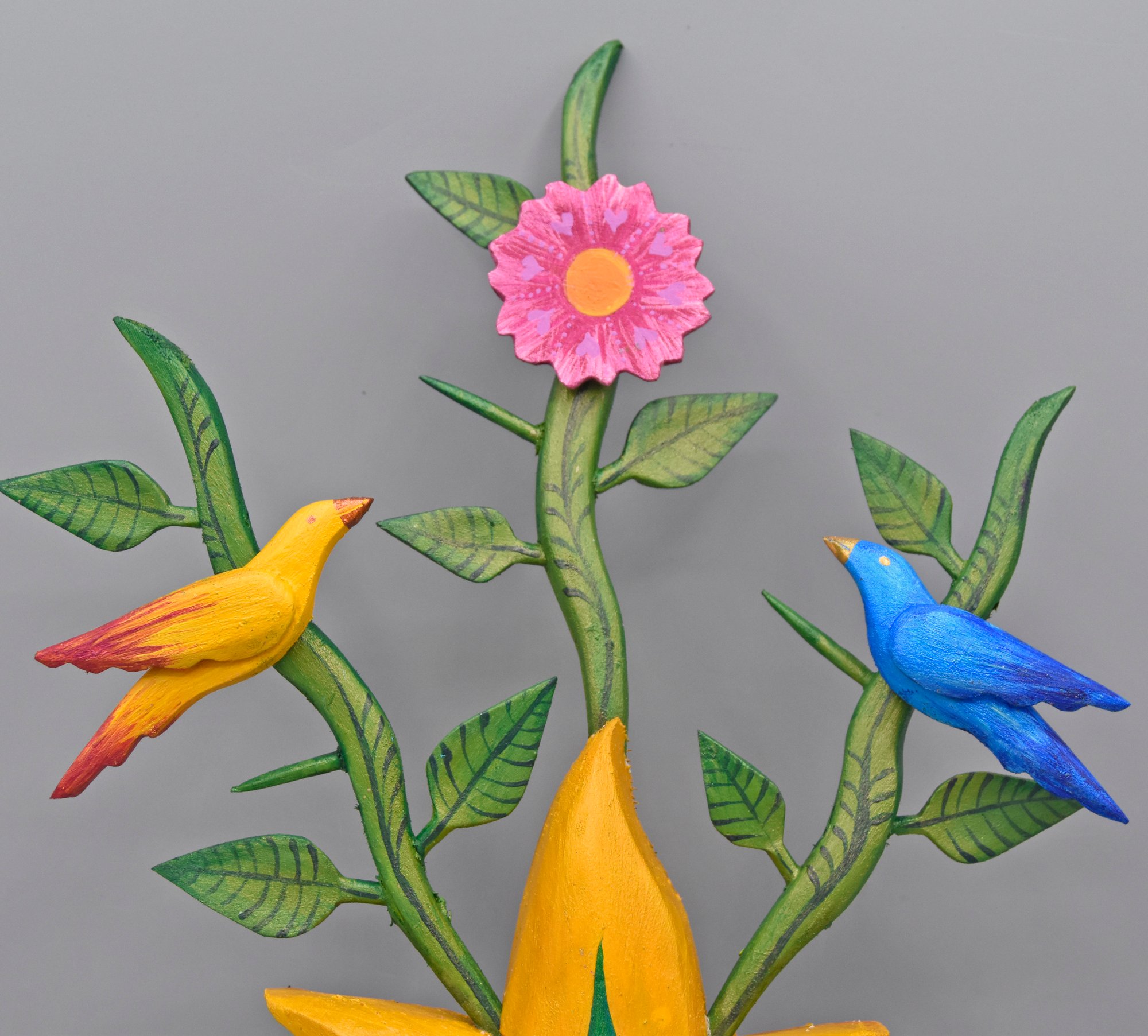 Carved from found aspen wood this radiant heart is crowned with flames, leaves, flowers and birds. There’s a an antique keyhole escutcheon nailed to the delicately painted surface. Inside the keyhole are tiny painted clouds in a blue sky. The wood is painted with acrylic. There is a hook on the back to hang the artwork.
