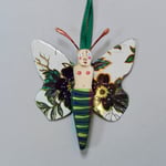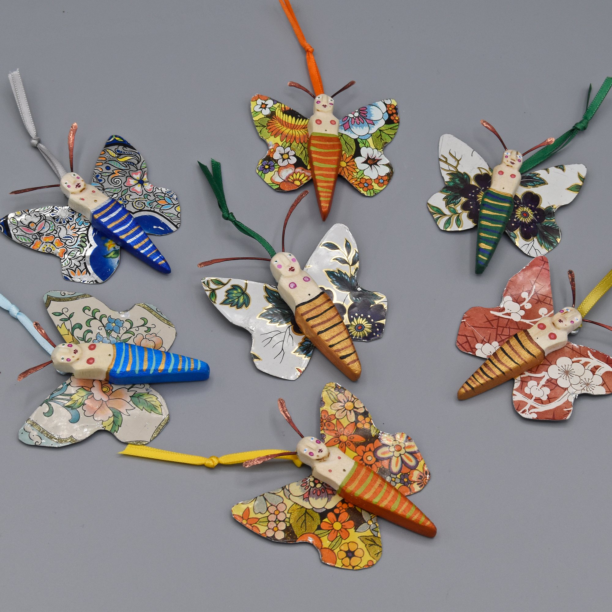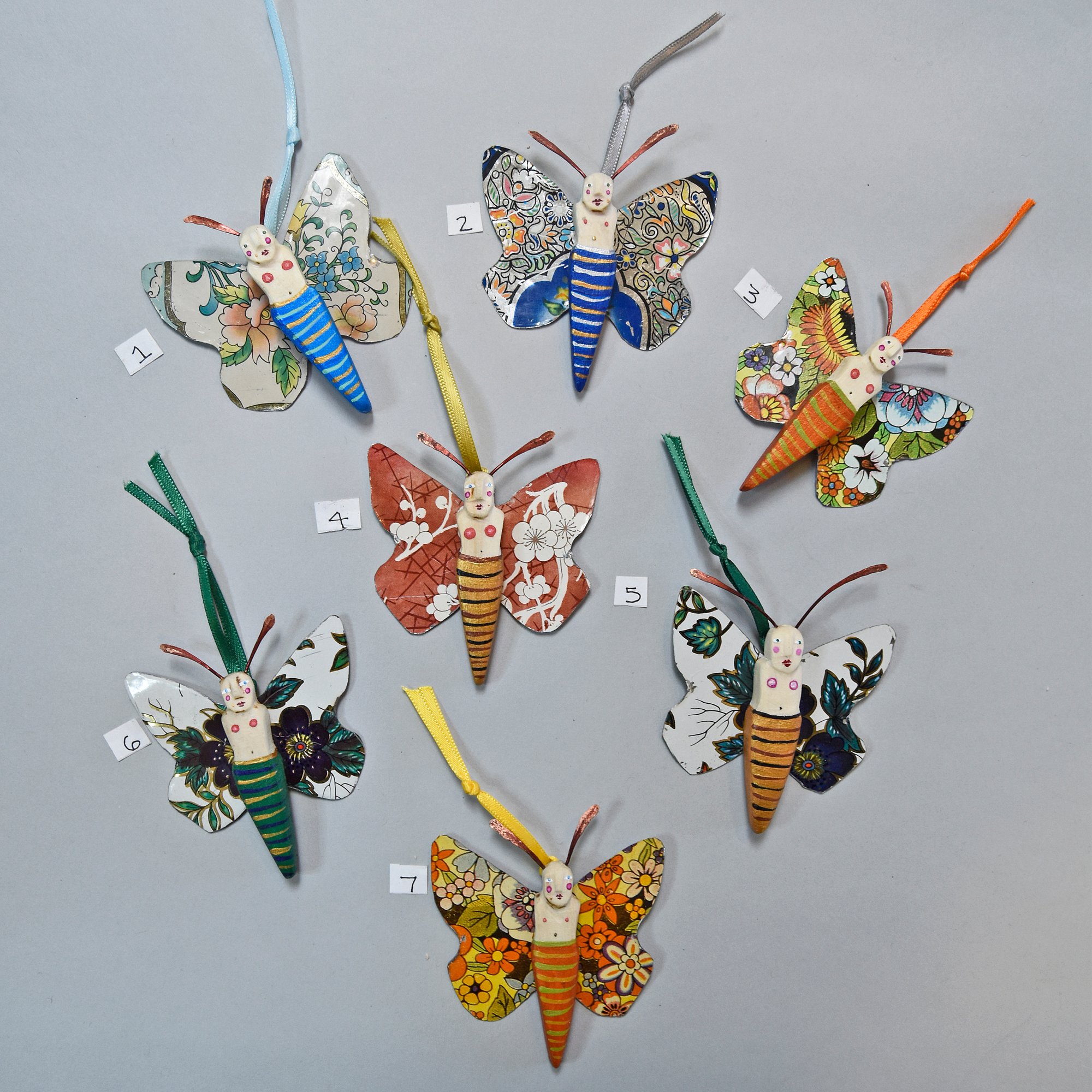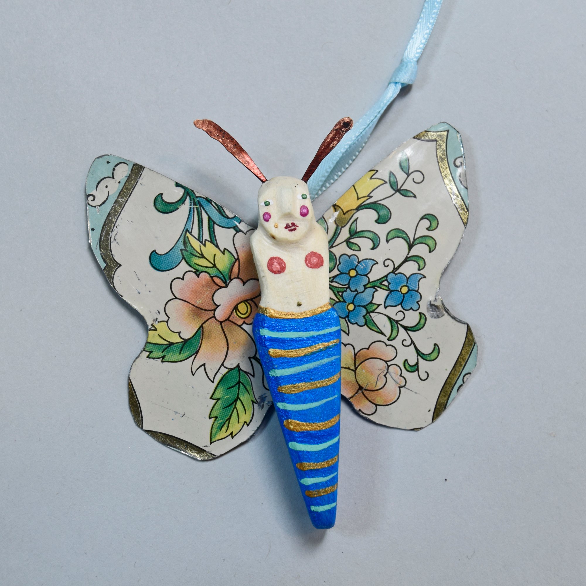 The Butterfly Babies are carved from fallen aspen wood collected in the mountains of Northern Arizona and New Mexico. The wings are made of vintage tins. They have hammered wire antennae. They're delicately painted with acrylic and finished with wax. Each has a small hook on the back to easily hang it. Size: 2.75" x 2.5"