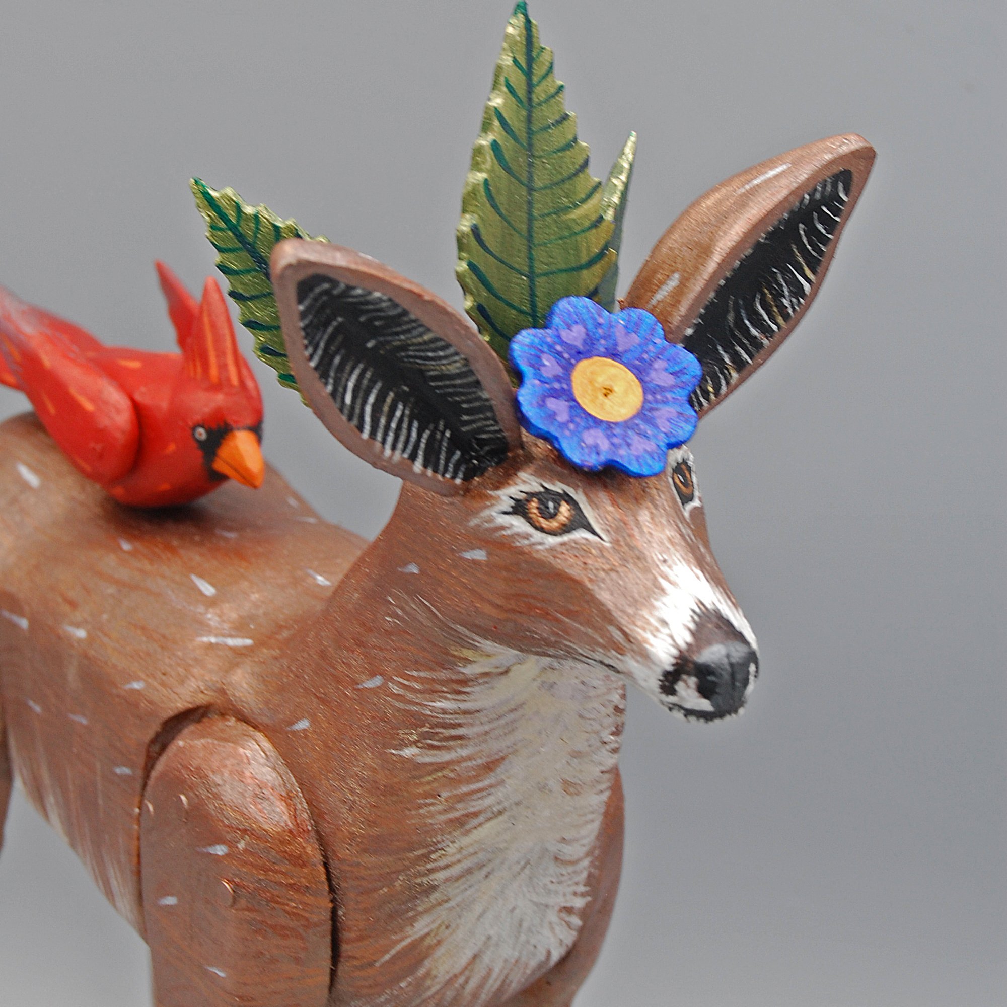 Carved from found aspen Cardinal Doe is part of a new series called Animal Tales. Each piece in this series tells a story of mysterious relationships between animals. It's delicately painted with acrylic.