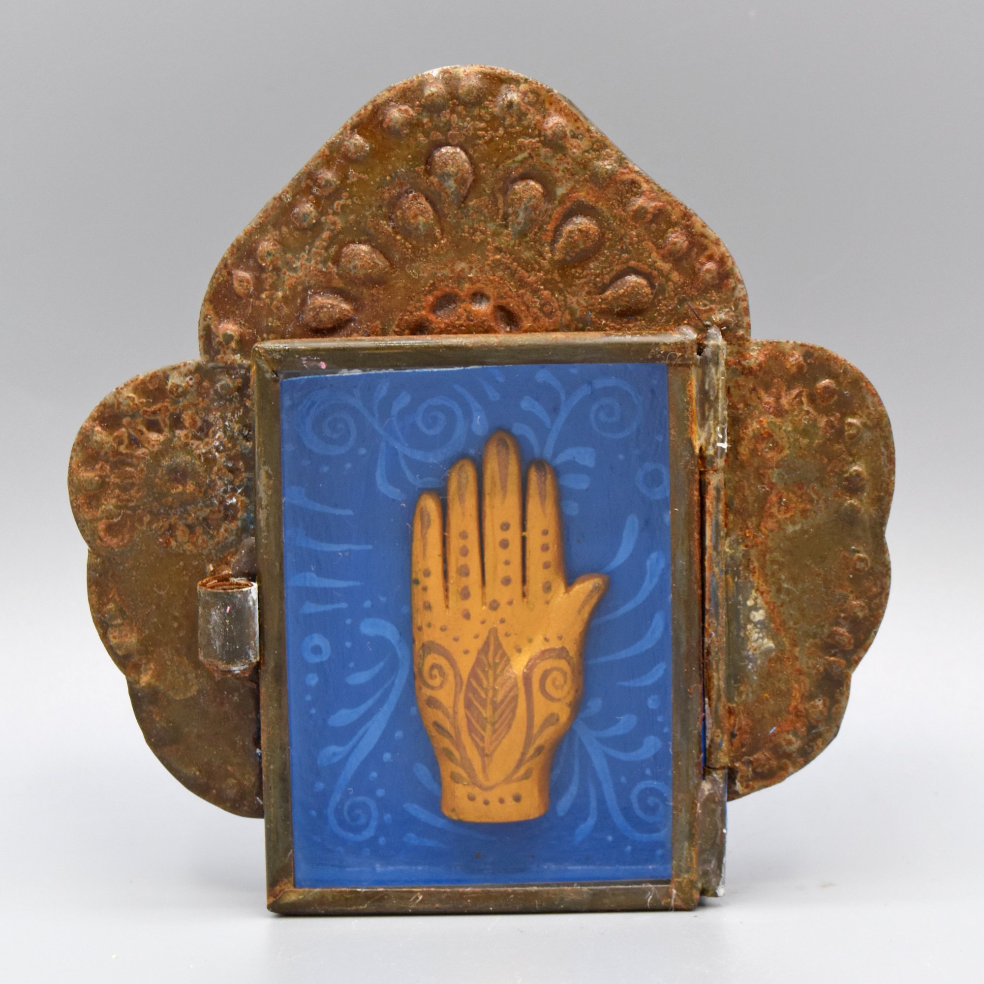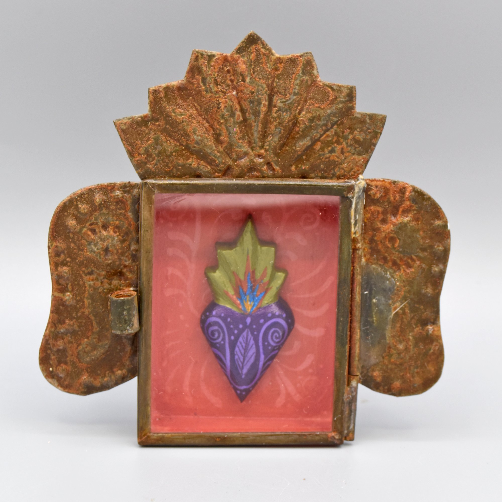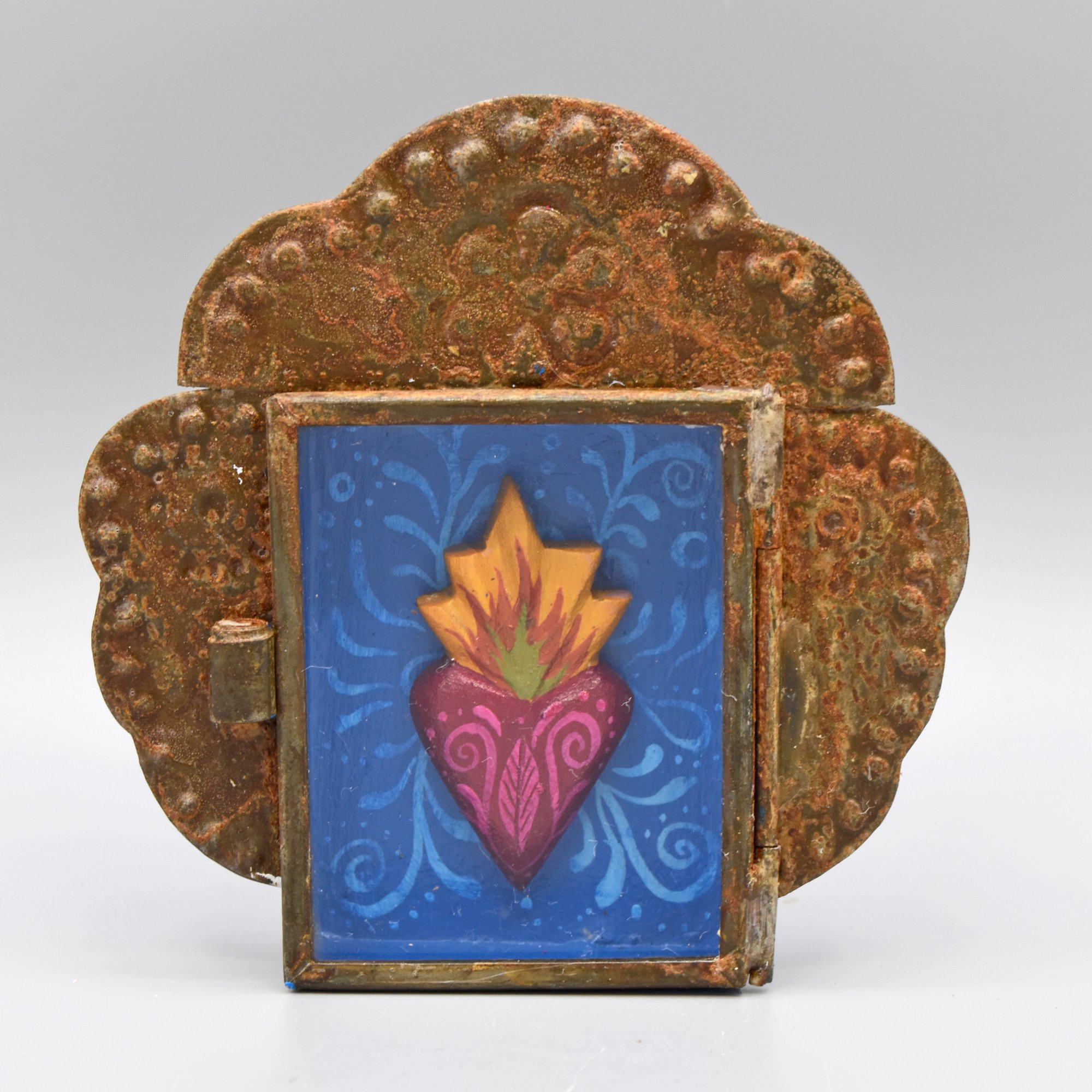 The Nicho Series is inspired by objects of prayer and gratitude, ex votos and milagros from Mexico and Latin America. Traditionally Milagros were used as offerings to request help or give thanks for assistance with any number of circumstances, from mending bones to finding lost pets. Frequently they are used in requests for healing. The word "milagro" is Spanish for "miracle". The tin boxes are made in Mexico. Inside this nicho is a heart carved from fallen aspen wood. The heart is delicately painted with acrylic. The glass door to the box can be opened if desired. 3.25"h x 3"w x 1/2"d