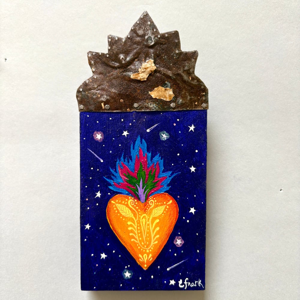 The Night Hearts Series- In the infinite universe love is eternal. These are acrylic paintings on birch wood panels with antique tin nailed to the top. Each small painting has a hook on the back to hang it.
