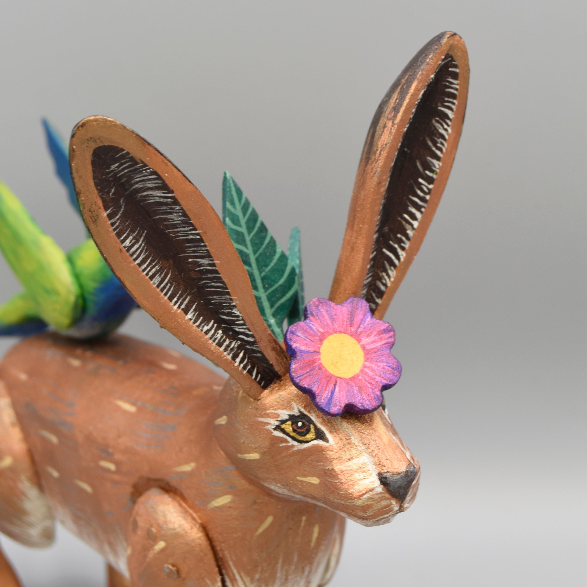 Jackrabbit and Hummingbird is carved from found aspen wood collected in the mountains of the Southwestern US. It's delicately painted with acrylic. Each piece in this series tells a story from the mysterious realms of the animals.