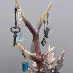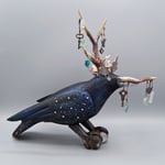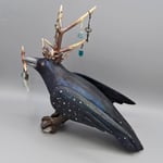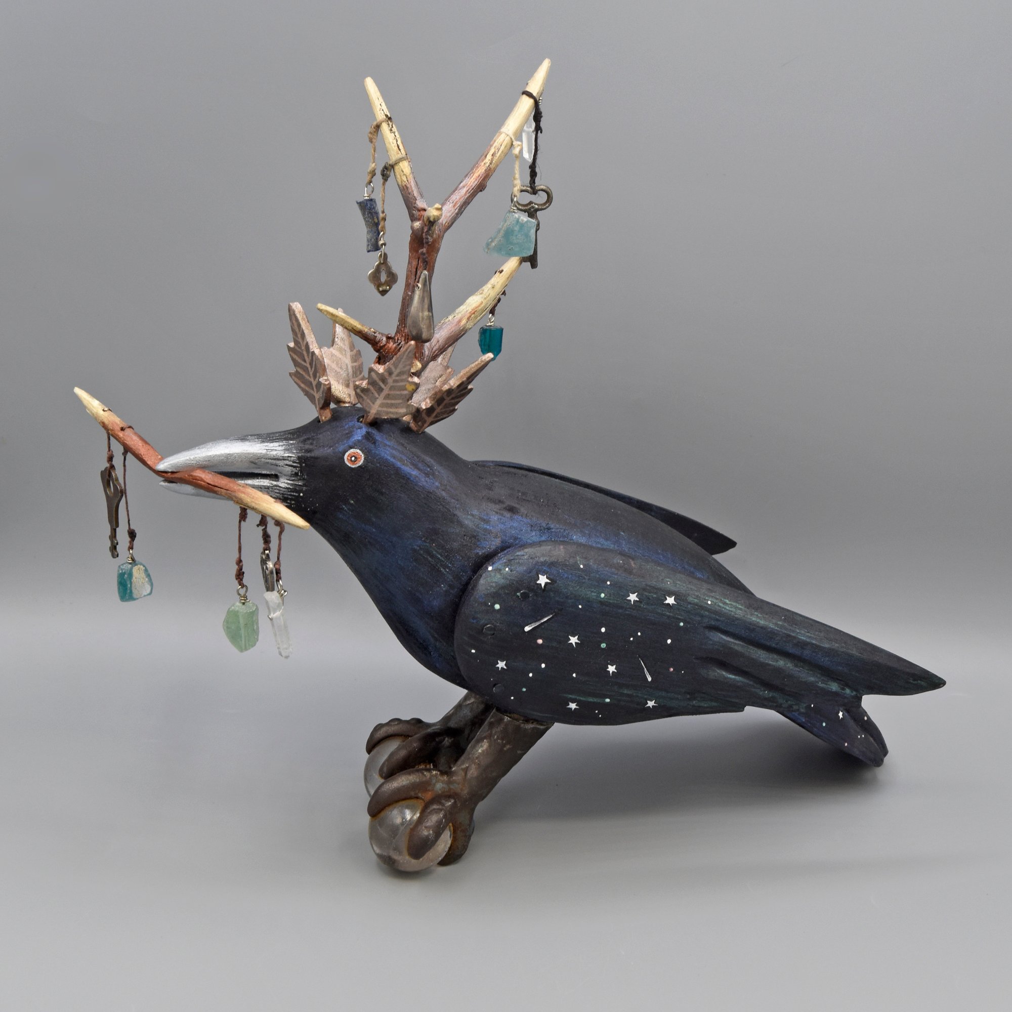This is Reliquary Raven No. 2. It's carved from found aspen. It's painted with layers of iridescent acrylic and a pattern of tiny stars. The claws are vintage Victorian furniture feet made of iron with clear glass. It has a twig crown and a wreath of leaves. In its mouth it holds a twig. The twigs it wears and holds contain an array of relics made with found objects, quarts crystals and antique Roman glass. The twigs and leaves are removed for shipping and the sculpture requires simple assembly.