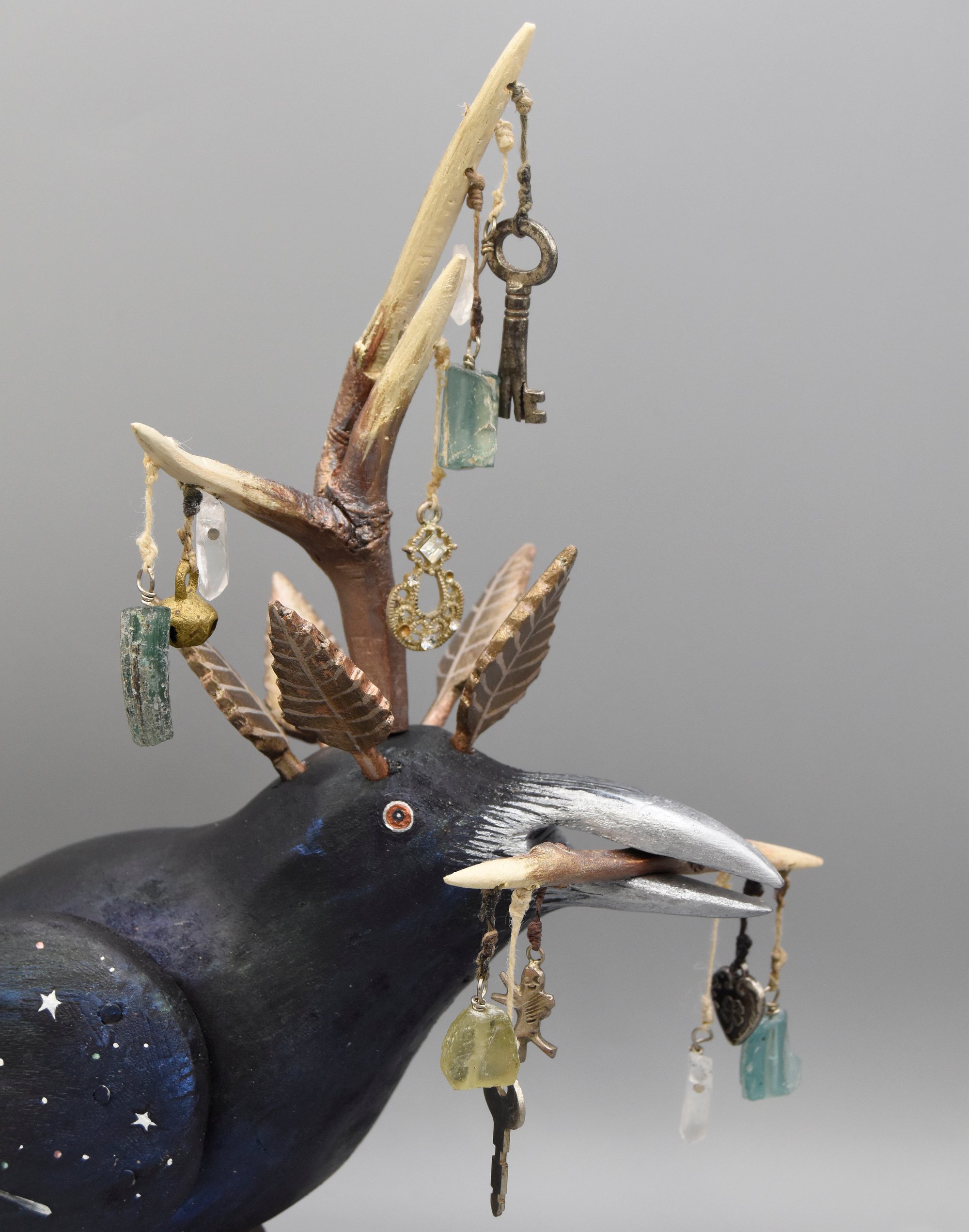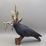 This is Reliquary Raven No. 2. It's carved from found aspen. It's painted with layers of iridescent acrylic and a pattern of tiny stars. The claws are vintage Victorian furniture feet made of iron with clear glass. It has a twig crown and a wreath of leaves. In its mouth it holds a twig. The twigs it wears and holds contain an array of relics made with found objects, quarts crystals and antique Roman glass. The twigs and leaves are removed for shipping and the sculpture requires simple assembly.