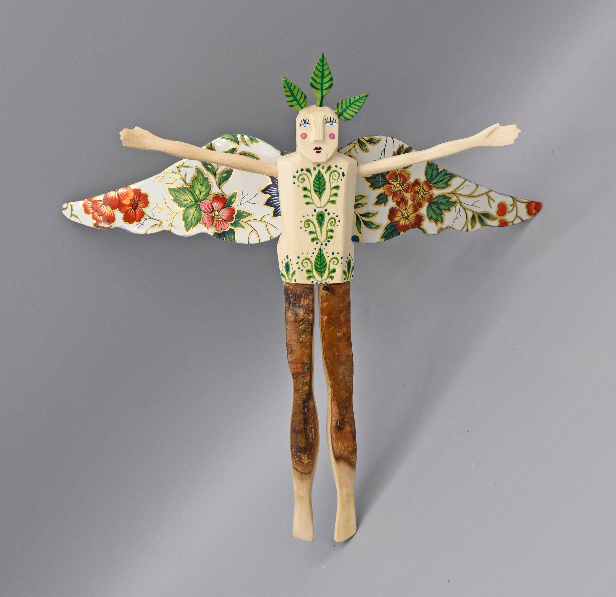 The Tin Can Angels are happy little sprites carved from found aspen wood with wings made from antique tin.