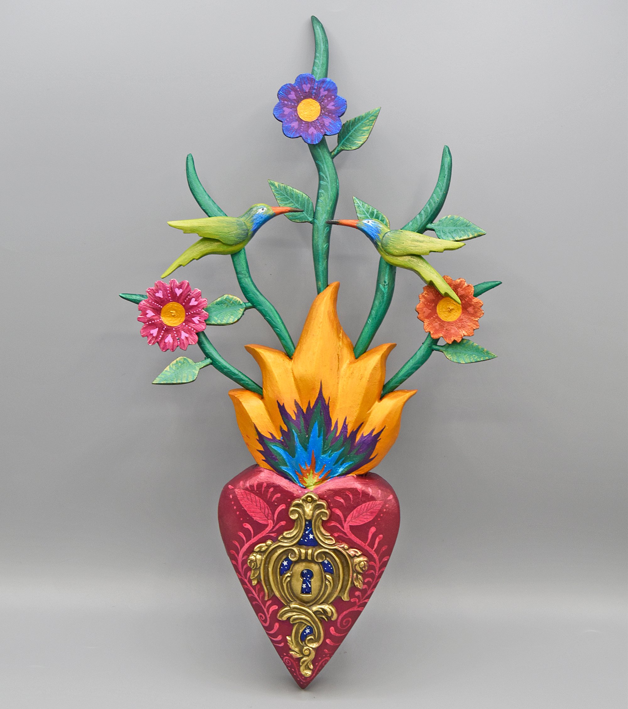 Carved from found aspen wood this radiant heart is crowned with flames, leaves, flowers and hummingbirds. There’s a an antique keyhole escutcheon nailed to the delicately painted surface. Inside the keyhole are tiny painted stars. The wood is painted with acrylic. There is a hook on the back to hang the artwork.